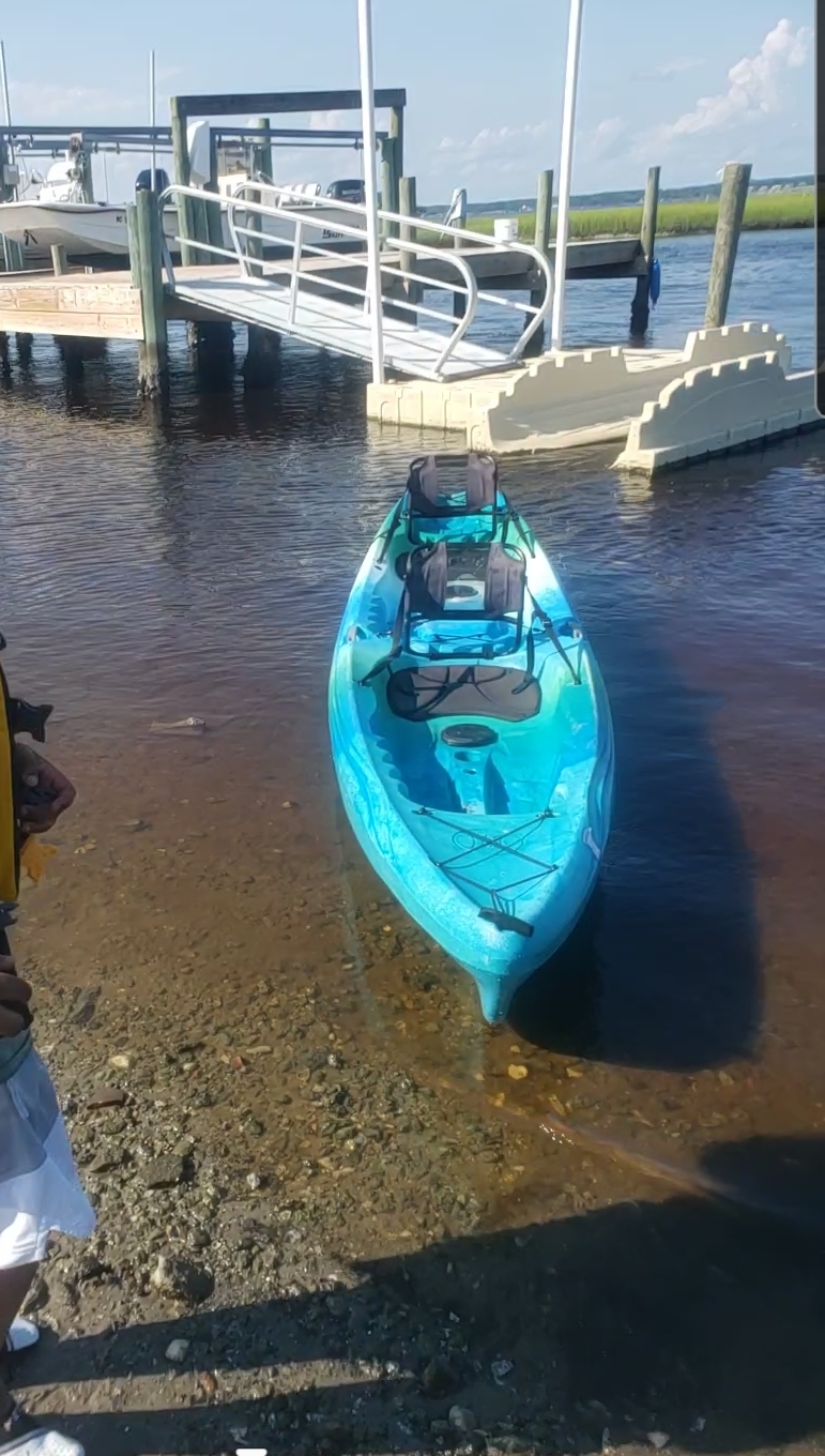 I recently took my son on vacation to the beach before school started. I have never been kayaking and figured this would be an exciting experience for both of us. I purchased lifejackets, water protective gear for our items, and swim shoes to prepare for the adventure. I called the shop to see if we could have a tour guide go with us but was informed the guide had already returned to school. On the day of our kayaking adventure, we were taken out to the kayak in the picture and provided procedures of how to work the paddles.